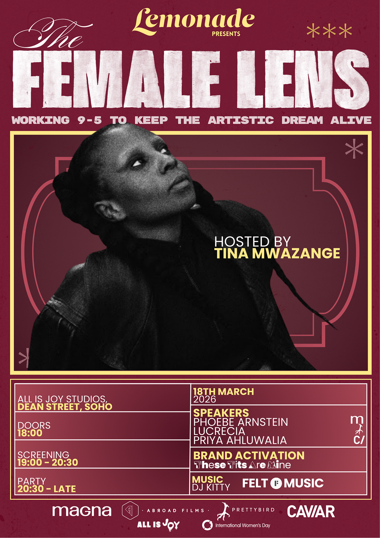 Part of International Women’s Day celebrations, The Female Lens is made possible by the generous support of our sponsors. A huge thanks to PRETTYBIRD, Magna, Caviar, Abroad Films and Felt Music whose commitment to championing female talent and meaningful industry conversation has helped bring the event to life. We simply could not do this without them.