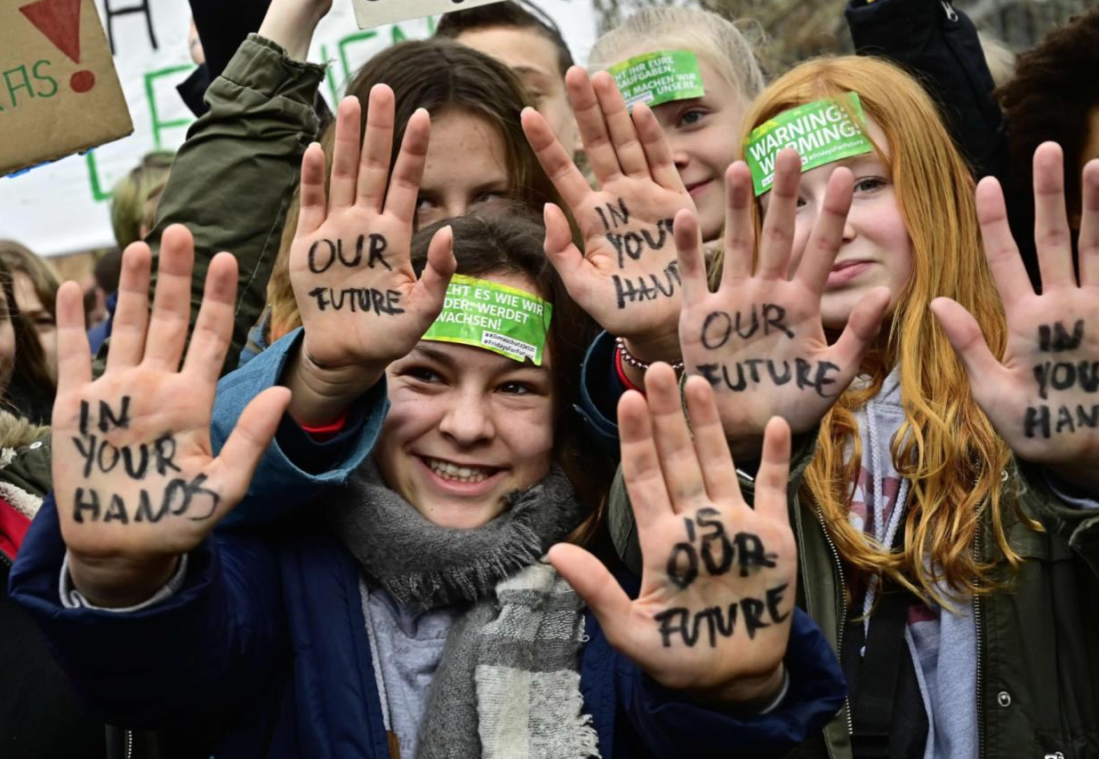Above: Young citizens coming together during the 2019 global climate strikes. Photograph by Tobias Schwarz/AFP/Getty Images.