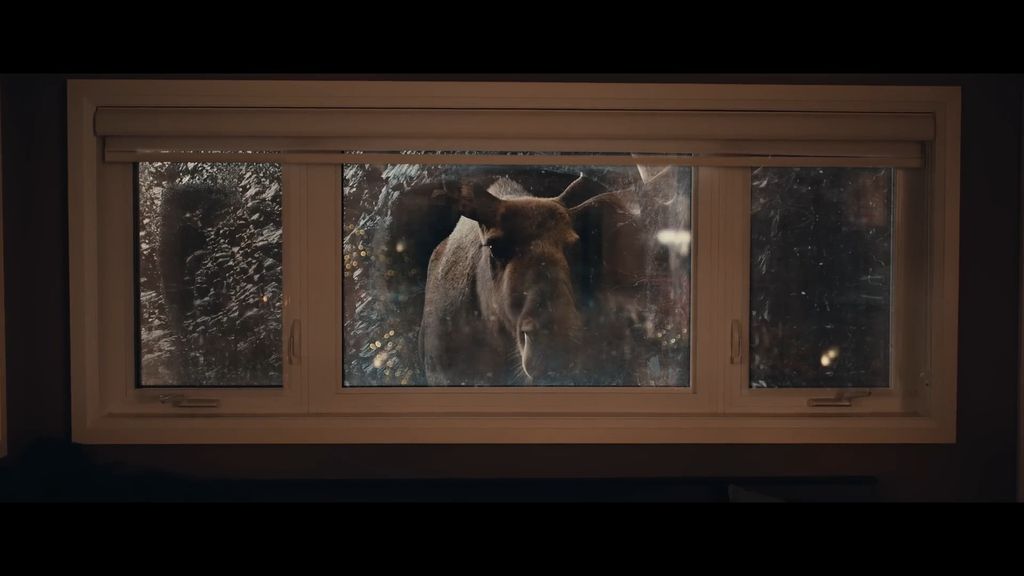 The hero film follows the solitary moose as it wanders through quiet suburban streets, gazing into homes where families gather to celebrate the season.