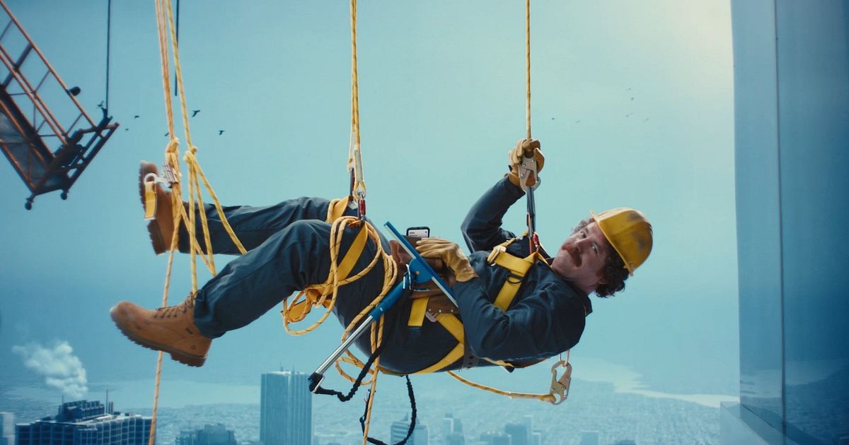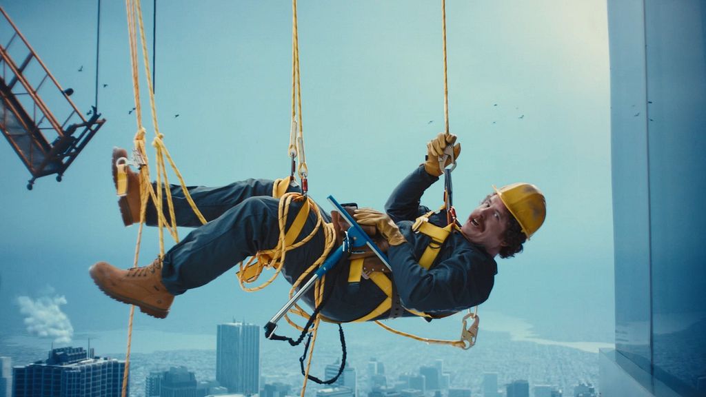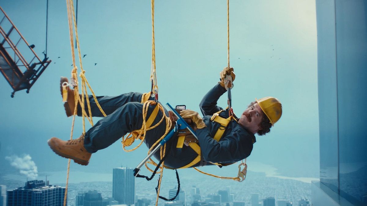 Window Washer: Also built in Unreal Engine, also a harness, also a situation that looks way more comfortable than it was. Same minute-at-a-time deal as the biker. The detail I love most in this spot is the foreground skyscraper that appears right next to him, which is actually just a piece of plexiglass we tinted and lit to catch reflections from the LED wall behind it. That whole trick came out of pre-pro. I do all my own AI storyboarding for projects like this, and while I was generating frames I started playing with how to sell the idea of a real building next to him without having the resources to actually build one. I composited a window element in Photoshop, faked the reflections, and could see immediately that it was going to work. We tested it on our build day and it came together even better than I'd hoped. Add in some moving steam and a flock of birds drifting through the Unreal Engine background, and the whole thing reads as a guy genuinely dangling thirty stories up next to a skyscraper.