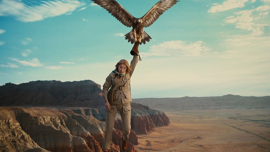 Falconer: The talent was in a full body harness connected to a pulley system rigged from the ceiling, operated by two SFX people who could move her up and down to sell the feeling that she's airborne. We did pre-vis models of the eagle first to lock in size, look, and flight pattern, then matched the final animation to her real pulley movements after the shoot. The bird itself was built from elements in Photoshop, using real pieces from our live action like the glove on her hand to help the composite blend, then animated using AI. The desert canyon she's flying over is footage I happened to shoot myself on a cinema drone out West a while back. I picked a sequence that subtly carries her higher and higher into the sky throughout the spot, raising the stakes with every wingbeat. The big production challenge was the wind. To get her hair whipping convincingly, we had to blast a fan at full volume right at her face, which made capturing usable dialogue almost impossible. We spent a lot of time in a sound booth after the shoot recording wild lines and lip-syncing everything in post. The line that always kills me is "my mom called my new haircut brave," which our creative director Josh came up with as an alt on the day.