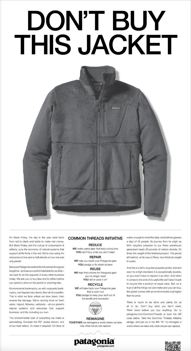 Above: Patagonia’s ‘Don't Buy This Jacket’ was a 2011 Black Friday campaign urging consumers to consider the environmental impact of their purchases. It encouraged buying only what is needed and choosing high-quality, long-lasting products.
